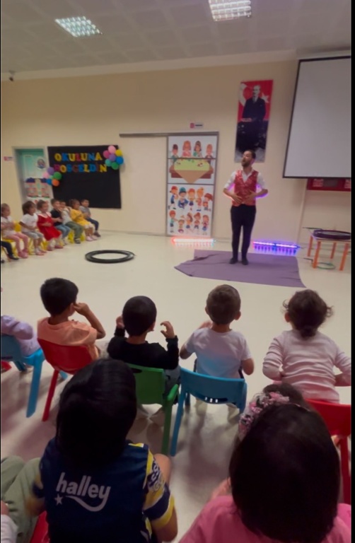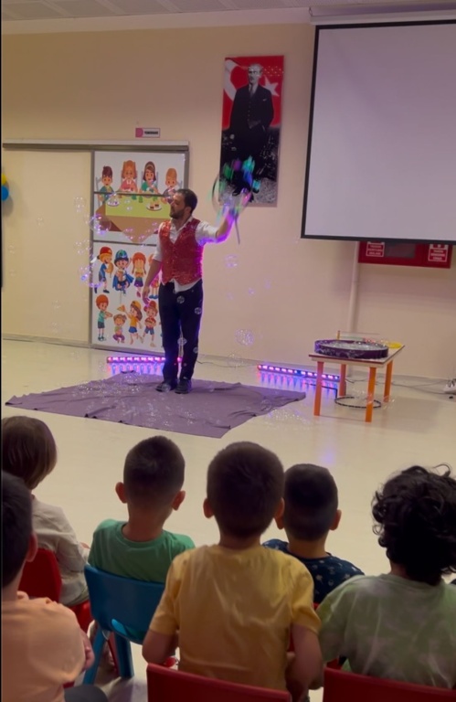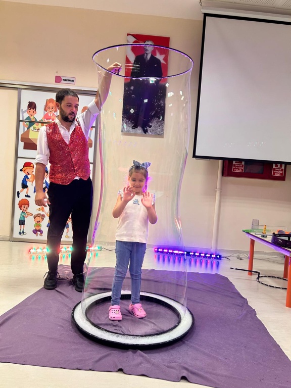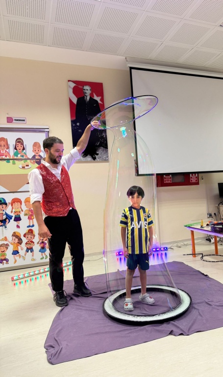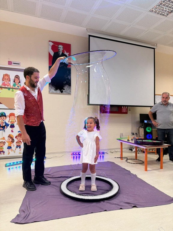 Öğrencilerimize, oryantasyon süreci içerisinde "Okuluna Hoş Geldin" kapsamında bubble show gösterimi düzenledik. Farklı boyutlardaki baloncukları hayranlıkla izleyen miniklerimiz, baloncukların hareketini takip ederek dikkat ve gözlem becerileri geliştirirken, dev baloncukların içinde keyifli dakikalar geçiren öğrencilerimiz, etkinliğe aktif katılımlarıyla salonu neşe ve kahkahayla doldurdular.